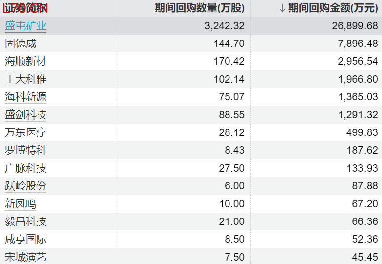 16家上市公司股票获回购,盛屯矿业回购金额最高