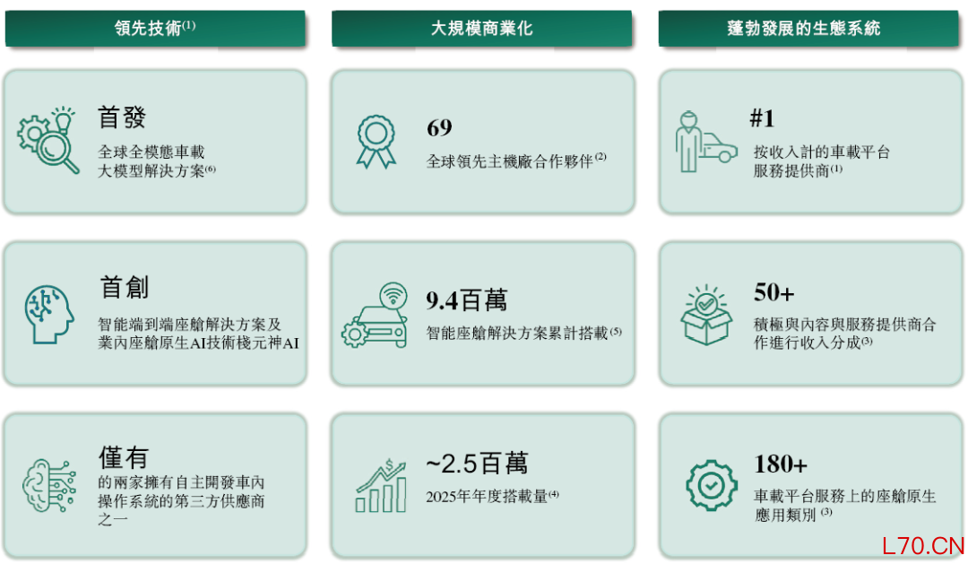 截至2025年12月31日,斑马智能的智能座舱解决方案已在69个主机厂的940万辆车上搭载,覆盖超过16个国际市场。公司的车载平台服务涵盖180多个品类的座舱原生应用,范围从娱乐、导航到生活方式及实用工具。根据灼识咨询的资料,斑马智能在中国所有的智能座舱提供商中覆盖的座舱应用最广。此外公司拥有行业内最广泛的芯片适配能力,是少数几家拥有完全自主研发的汽车操作系统、且能兼容国内外多种车规级芯片的企业之一,公司兼容的车规级芯片企业包括紫光展锐及黑芝麻智能等。