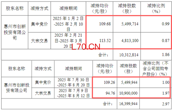 具体来看,2025年内,公司第二大股东——惠州市国资委旗下的惠州市创新投资有限公司(简称“惠创投”)便先后实施两次减持,累计减持2,671万股,占当时总股本的4.8%,套现金额高达28亿元。