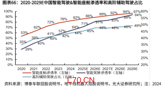 预计在2025年,智能驾驶、智能座舱的渗透率分别增至64%、82%,且预计至2029年,两项渗透率将进一步增至97%和94%。