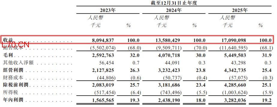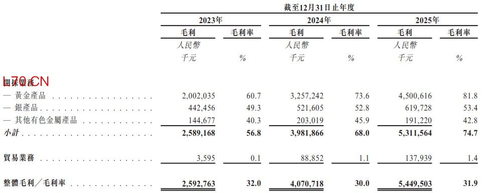 招股书显示,山金国际的收益在过去三年呈现出高速增长的态势,但驱动这一收益规模增长的核心动力并非高利润的黄金开采业务,而是利润空间相对较小的金属贸易业务。2023年、2024年和2025年(以下简称“报告期内”),公司的总收益分别为80.94亿元、135.8亿元和170.9亿元。